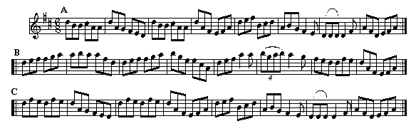Walter Jackson This setting comes from Chris Langan in Move Your Fingers. The tune was first published as Jackson's Nightcap (1778), this jig later appeared as Strike the Gay Harp in O'Neill's Collection, in the key of C. It's a favourite amongst Irish pipers. |