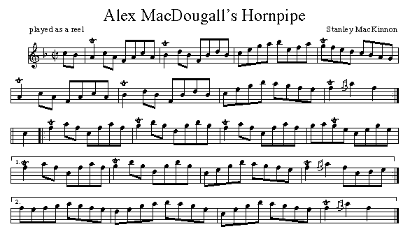 Composed for my good friend and great fiddler, Alex MacDougall from North Sydney.When I met him first in the '80s and witnessed his music, I knew we would become friends and I would learn from him. He had the old 'Angus Chisholm style', and I wanted dearly to tap into that. He helped me overcome my reluctance to play in public, and encouraged me to 'keep at it'. Shortly after sharing the stage with him at an outdoor Ceilidh in Cape North in 1986, I was more than delighted to receive from Alex, an old copy of Dan Hughie MacEachern's First Collection, which was for years unavailable anwhere, along with dozens of sheets of music that Alex had gathered over the years. I am endebted to him for his inspiration and support.This tune is a tribute to one of the finest gentlemen I have ever known - and to his wife Rita. S.M.K. Nov. 10, 2001