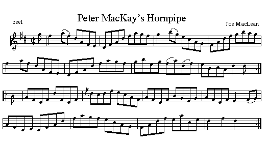 The notation above is as written by Joe MacLean for his close friend Peter MacKay, the Scotsville-Inverness mailman. The sound clip is from Joe's brother Michael Anthony. Joe himself played the tune a bit different.