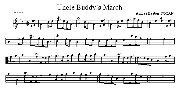 Recorded on Andrea's first CD, Licence to Drive 'er. Notation above first published in Tunes from the Albums, a book by Andrea Beaton.Buddy MacMaster's youngest sister Betty is Andrea's mother.