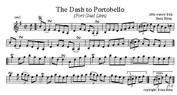 Sean Ryan was one of the most influential 20th century Irish composers.The names of his tunes were apparently not as important to him as the melodies. He recorded the above reel twice in the 1950s - once as Sean Ryan's Favorite and again as Port Gael Linn. Today the most common title is The Dash to Portobello as given in his book, The Hidden Ireland.The Mp3 comes from Milestone at the Garden, Irish Fiddle Masters from the 78 RPM Era, a CD compilation by Rounder Records. It is also heard on Sean Ryan's Double CD last upddate 7/4/04 |