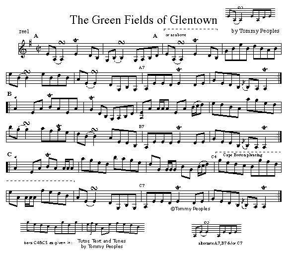 The composer's original setting and its history is given in Tutor Text and Tunes - a book published in In Ireland during 2015. It is available direct from its author, Tommy Peoples.Above is very close to Tommy's setting (albeit with the addition of a few Cape Bretonisms /ornaments etc). Introduced to many Cape Bretoners through the playing of Arthur Muise who had learned it from Robert Stubbert. Robert got it from one of Tommy's mid '70s recordings.