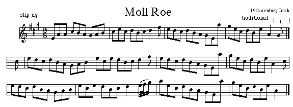 Moll Roe is the final jig in a beautiful set of slip jigs on Leitrim's Hidden Treasure by The McNamara Family. This arrangement has also been published in The Silver Apple News Other Examples of Music Notation Site Search Engine last upddat11/14/99