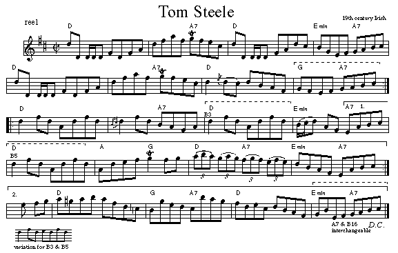 Sometimes called Hand Me Down the Tackle this reel was first published as Tom Steele in O'Neill's Collection and later popularized by Michael Coleman the above Cape Breton setting comes from Jerry Holland The 2nd Collection. As a youngster Jerry would have heard Angus Chisholm play it. Chisholm was a fan of Michael Coleman.