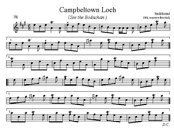 In Cape Breton this is generally interpreted as a jig however, in early Scottish collections, it was arranged both as a quickstep and as a 6/8 march. The setting above comes mainly from Kenneth and Angus MacKenzie who drew from MacInnes' setting (1940). My arrangement adds some fiddle touches plus the addition of an octave jump in the A part 2nd ending (from the Gunn Collection, 1840s).