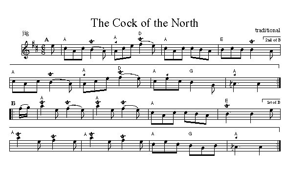 A popular tune for beginners, this tune appeared as an Irish jig titled Cock Crowing. In later pipe collections it was generally set as a 6/8 march. i. Donald MacDonald, c.1822. ii. John McLachlan, 1854. iii. J & R Glen, 1870. iii. David Glen, book 9, c.1892. iv. Logan's Tutor, c.1901. v. Johnny MacLeod, Mabou Coal Mines CD. vi. The Cape Breton Highland Collection (as above).