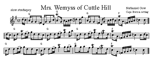 Gow's original tune appeared altered in Anderson's Collection with another title. As well a very similar melody Alasdair MacAlister is transposed up a tone and altered further in various 19th century collections. Our Cape Breton setting, in the mixolydian mode (instead of the original Aeolian) comes primarily from Mary Hughie MacDonald. It differs both rhymically and melodically from any of those previously published arrangements.i. Gow Vol. 3, 1792. ii. Anderson Vol 2, 1793 a(as Lochgary's) iii. Skye Collection (as a reel ? - obviously a typographical error). iii. Home tapes of Mary Hughie MacDonald & Dan Joe MacInnis. Notation from The Cape Breton Scottish Collection.