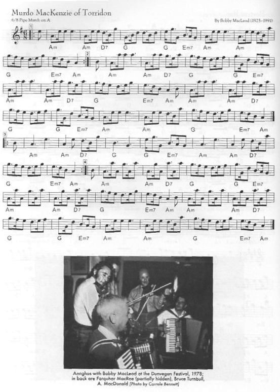 A popular tune, Bobby MacLeod (1925-91) was an accordion aplayer and piper from the Isle of Mull. In Cape Breton 6/8 marches are often played as jigs and this one was recorded that way on an early LP by fiddler Johnny Wilmot.The scan above is a page layout from Angus Grant's book, The Glengarry Collection