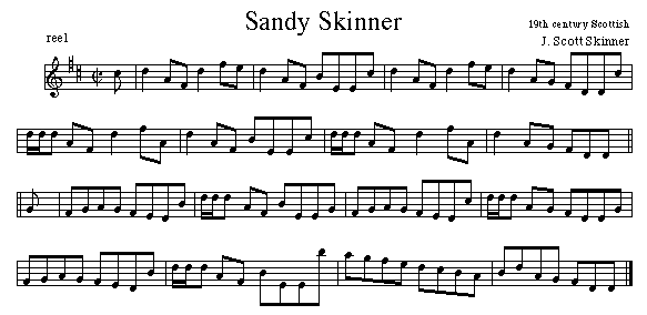 Recorded on a 78 disc by Bill Lamey where it was played in as the final tune of a medely which included Dr, Shaw and The Breem Dog (two tunes from The Harp and Claymore Collection, 1903) (Dr. Shaw is also in Jerry Holland: The 2nd Collection. The above reel is a few years older, first published in 1887, in The Logie Collection. Skinner's original used cuts (trebles) on all the quarter notes above. Lamey did vary further by adding drones, hammer-ons and trills.See - The Cape Breton Scottish Collection.
