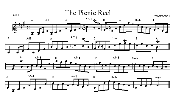 The above transcription is from Brenda Stubbert's Collection. Brenda learned it from family friend Winston Fitzgerald. Winston had used it for the theme music on his long-running radio show. It is likely American in origin, first appearing in Ryan's Mammoth (1883). There is also an Irish hornpipe setting in G called The Flowing Tide.The Picnic Reel has been recorded dozens of times ... a few of those include: