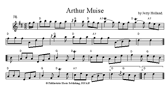 Arthur had a great swing for dance music and Jerry composed a great jig to match. Notation above first published in Jerry Holland's Collection of Fiddle Tunes.Although I wrote the tune out with Jerry in about 1990, and was involved with his casstte recording of it later that year, it took a few years before I got around to learning it with Siobhan O'Keeffe of Dublin.