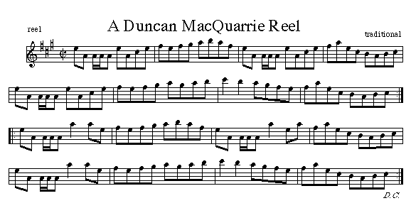 Fiddler Duncan MacQuarrie was a great influence on Cape Breton pianist Doug MacPhee. On the Celtic Colours CD, Ceillidh 2000, Dougie plays a medley of strathspeys and reels which concludes with this tune.This arrangement has also been published in The Silver Apple News