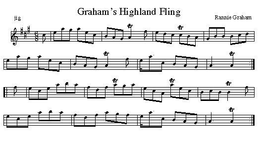 Graham's Highland Fling was a local tune, made by one of his friends from the Judique area. Dan R recorded it with Marie MacLellan on CX 28, an album made in the early 1960s. Subsequently he wrote it out for a number of younger players including his first cousin Alex Francis MacKay. Alex F. recorded it on his CD, Gaelic in the Bow. In the 1970s, due to the playing of Donald Angus Beaton, it was popular at dances in the Mabou area.
