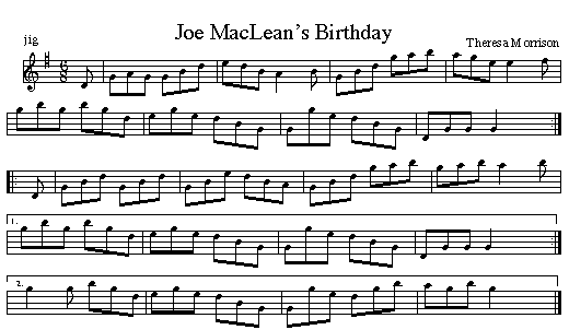 Theresa started composing in the '80s. This is one of her earlier tunes. It is recorded on her CD, Laments and Merry Melodies from Cape Breton Island. Other Examples of Music Notation Cranford Pub Search Engine last update 2/6/02