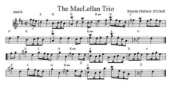 The MacLellan Trio (Donald Marie and Theresa) made 78 and LP records during the 50s and 60s. Theresa MacLellen was a big influence on Brenda and her tune was composed in a style which reflects the music the MacLellen's played together. The notation above comes from the book Brenda Stubbert: The Second Collection. She recorded it on her Endless Memories CD.Other Examples of Music Notation Cranford Pub Search Engine 11/22/08