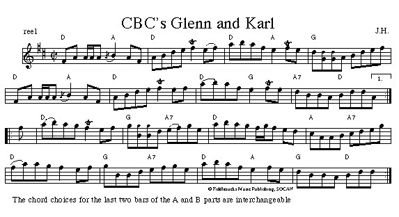 CBC's Glenn and Karl (Glenn Meisner and Karl Falkingham) work at CBC Halifax. This tune is in Jerry Holland's Collection. The sound clip comes from Jerry's CD Fiddler's Choice. It has also been recorded on Highland Pipes by Dr. Angus MacDonald.