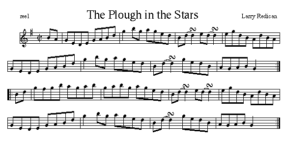 This popular reel cames from Larrry Redican, a fiddler originally from Ireland who spent much of his life in NYC. Before he left Ireland he was a student of Frank O'Higgins. Originally written in F, Carl MacKenzie plays it in that key. His nephews in The Barra MacNeills learned it from Robert Stubbert who had learned it in C from a concertina player.It can be heard on The Galway Rambler, a recent CD by Ena O'Brien