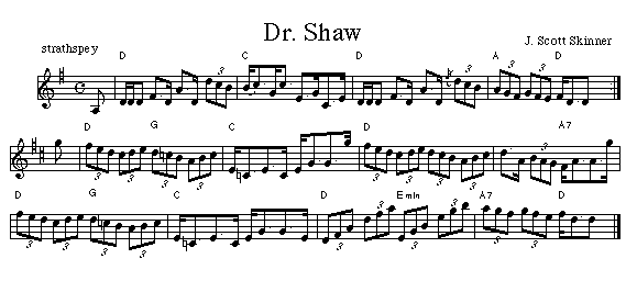 This J. Scott Skinner strathspey was made famous in Cape Breton by a Bill Lamey 78 disc. Bill had the knack for finding tasty tunes in old books. He found Dr. Shaw in The Harp and Claymore (1890). Jerry Holland recorded it on Crystal Clear. The arrangement above comes from The Second Collection