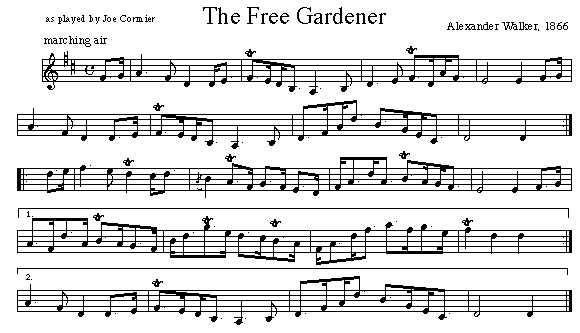 Before he emigratd to America Alexander Walker was employed as the gardener for Sir Charles Forbes of Castle Newe. Joe Cormier plays it on Rounder's Anthology CD, MacKinnon's Brook.