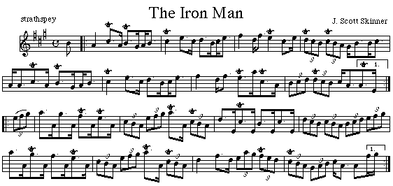 The Iron Man one of Skinner's most famous strathspeys, can be heard on Winston Fitzgerald: Classic Cuts. The above setting comes from Winston Fitzgerald, A Collection of Fiddle Tunes
