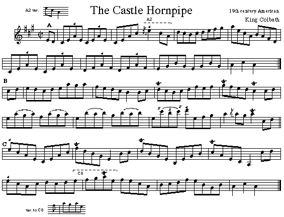 The Castle Hornpipe Link takes you to information and real audio from Natalie MacMaster's CD My Root's are Showing, This cut is from a live dance of Natalie and her uncle, Buddy MacMaster at a Dance in Glencoe. The above transcription is from Winston Fitzgerald's book. Winston learned this tune from 1000 Fiddle Tunes (Ryan's Mammoth,1883). Colbath was a New England based bandleader from the mid-19th century.