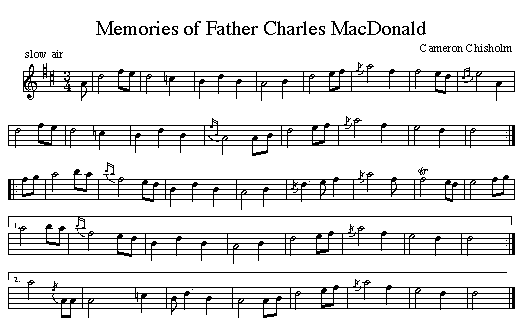 Margaree fiddler Cameron Chisholm composed this soulful lament many years ago. Recently it was recorded by Buddly MacMaster on his new CD The Judique Flyer. Fiddlers take note that if you listen carefully to the recording you'll notice Buddy uses an extra gracing (similar to a burl) at the beginning of the 2nd ending. I didn't try to write it out for fear of masking the basic melody.