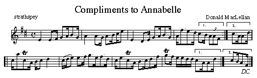 Donald has composed a few tunes, his most famous being the strathspey Dusky Meadow. Compliments to Annabelle can be heard on Donald's new CD or on David Greenberg's Tunes Till Dawn