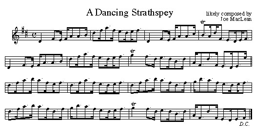 Released recently on both Joe MacLean and Theresa Morrison's CDs, this strathspey is speculated to be a composition of the late Joe MacLean. He taught it to Theresa in the mid-80s - without telling her its origin.In Joe's last few days his nephew Vince asked him how many tunes he had composed. At the time, she couldn't vocally answer (he had thoat cancer) but confidentally held up 10 fingers. When asked how many he had named Joe held up two fingers - after which he wrote the titles on a piece of paper (Miss Grace MacKenzie and Peter MacKay (a version is posted as played by his brother Michael Anthony. We're speculating that this is one of his 8 untitled tunes.