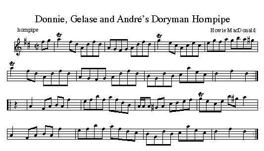 Howie MacDonald composed this hornpipe recently after a reunion session at the Doryman Tavern in Cheticamp. Fiddler Donnie Le Blanc played the Doryman every Saturday afternoon for perhaps 25 years. Gelase and Andre were his usual accompanists.Currently unrecorded, like many Cape Breton 'hornpipes' this tune is played up-tempo and could easily played in a medley of reels.