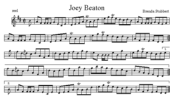 Brenda has long-admired the music of the Beatons of Mabou. The title tune on Tamerac 'er Down, was written by the late Donald Angus Beaton. The above tune was written for his son Joey. The notation above comes from her book, Brenda Stubbert's Collection of Fiddle Tunes.