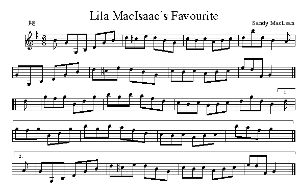 Howie MacDonald recorded this tune as Malcolm Beatons Jig on his CD titled Auld School. It was first published in The Cape Breton Collection, 1940 as Lila MacIsaac's Favourite. Lila was Sandy's piano player