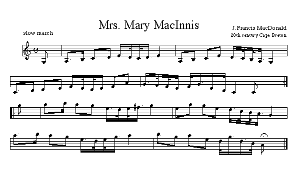 Notation above first published in Margaree Melodies. Composed for his mother, it was played by fiddler Dan Joe MacInnis. Other Examples of Music Notation