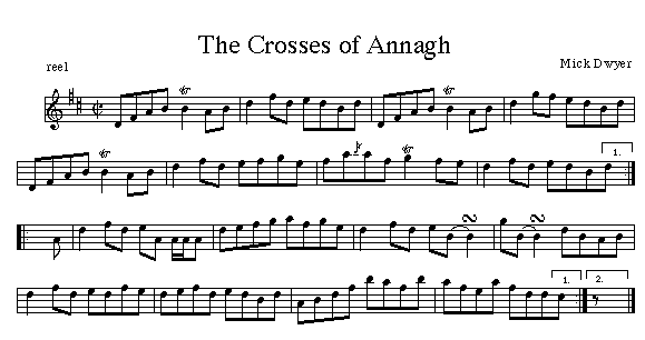This is probably the best known of tin whistle player Mick Dwyer's tunes. The title The Crosses of Annagh comes from the tradition, not from Mick (1940-1997). Apparently in the early '60s, after moving to the London area, Mick played the tune for Con Curtain, a Kerry fiddler also living in England. Clare fiddler Bobby Casey was also in London at the time. Eventually the tune took the name of a pub in County Clare. Other titles include Bobby Casey's, Con Curtain's and Dinny Ryan's Reel.