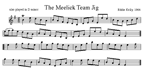 The setting above indirectly comes from a handwritten manuscript published in a late '70s thesis by Allan Jardine...."Eddy was born in Meelick, Eyrecourt, near Ballinisloe, Co. Galway, in 1933. Lived in that area till 1958, moved to Castlerea, Co. Roscommon. Has 20 compositions. Plays both button and fiddle. His compositions often exhibit a strong East Galway influence. Respected traditional musician, tunes circulated through sessions, radio performances, and concerts. "Meelick Team Jig commemorates a hurling team from his native parish which qualified for and played in the first All-Ireland Hurling Finals held in 1884." Other titles include: