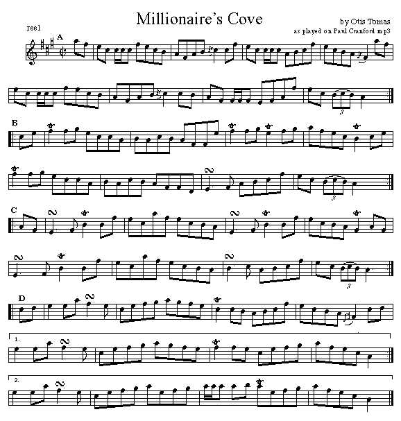 Millionaire's Cove - a 4 part reel by Otis Tomas Composed in the early 1990s this reel is found in The Fiddletree Collection. Millionaires Cove is part of St. Ann's Bay. Other Examples of Music Notation