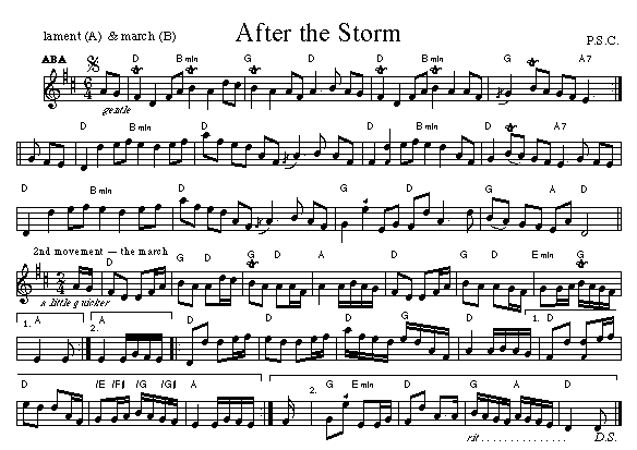 Title Notation Sound Clip / ABC After the Storm (P.S.C.) lament and march - LC MP3 Alice MacEachern (P.S.C.) reel - LC MP3 Rakesh (P.S.C.) reel - LC MP3 Wild Honey (P.S.C.) reel - LC MP3 14. Reels in F# minor & A major