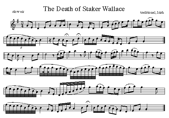 In the 1950s Chris Langan learned this setting in Dublin from fiddler John Dwyer (who at the time was a cadet for the Garda). It is similar to what was given in Roche's Collection, c.1911.Patrick Wallis (sic) was born in 1773, in County Limerick. He joined the United Irishmen and was chosen as commanding officer for the division at Moorestown. He was arrested by the local landlord for allegedly raising money to have him (the landlord), assassinated. In an attempt to get him to reveal what he knew about the plot, Patrick was tortured but he remained silent. Eventually he was executed and his head put on a stake (hence Staker).