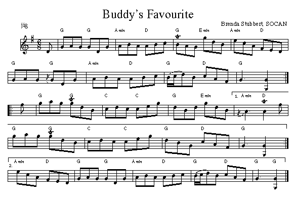 Brenda composed this tune in the mid '80s for Judique fiddler Buddy MacMaster and in 1987 she recorded it on her Tamarac 'er Down LP.Notation as above was first published in 1994 in Brenda Stubbert's Collection of Fiddle Tunes. Note that if you are carefully comparing the notation with her performance you'll discover that unlike the recording, when we wrote the tune out together Brenda elected to use the complete bar A4 as the turn-around to return to the final ending written above (on the LP she used a one note pick-up to the ending)