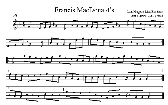 Dan Hughie MacEachern (1914-1995?) was one of the greatest Cape Breton composers. This tune comes from Dan Hughie's 2nd collection (both of his books are currently out of print). He was fond of the key of Gminor, and although his book had the above jig written in two flats, since Dan Hughie, and most of the old-timers played the majority of their G minor repertoires the Dorian mode, I adjusted the signature to reflect those tastes.Francis MacDonald (1931-2014) was a fiddler, piper, storyteller, artist, singer and composer. In 2006, he and his son Roddie released Margaree Melodies, a book consisting of both original and traditional fiddle music.