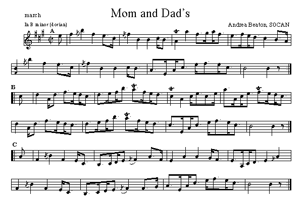 Above is a transcription of this march as played by the composer on her 2nd CD " Cuts". It is also found in Andrea's book - Tunes from the Albums