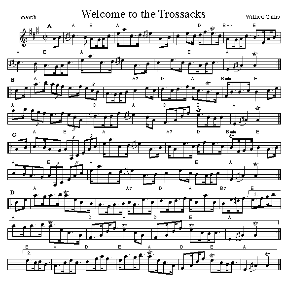 Wilfred Gillis was one of the fiddlers who formed the original Cape Breton Symphony. Welcome to the Trossocks was recorded on Natalie MacMaster's CD. In My Hands. This transcription comes from Jerry Holland, The Second Collection.