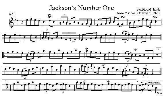Recorded by Michael Coleman in 1925 as one of two two tunes in a medley titled Jackson's Reel(s). That recording has been reissued on Milestone at the Garden, Irish Fiddle Masters from the 78 RPM Era, a CD compilation by Rounder Records. Other Examples of Music Notation