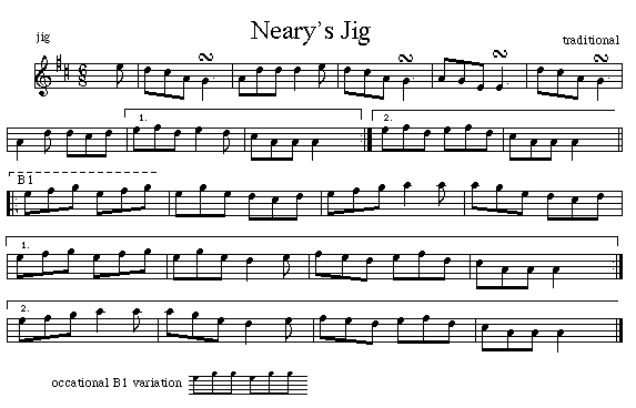 First recorded by Chicago fiddler Johnny McGreevy, this jig is associated with Jimmy Neary, a Mayo born fiddle who emigrated to Chicago in the 1920s. Irish piper Brian McNamara, recorded it on his CD A Piper's Dream.