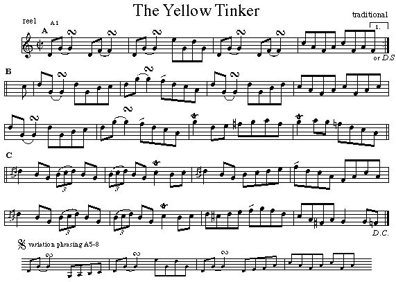 Nataile MacMasterThe Yellow Tinker is a popular Irish reel which has been recorded many times. One influential 78 disc was recorded by accordionist Paddy O'Brien in 1951. In Cape Breton the first recording was by fiddler Johnny Wilmot & pianist Doug MacPhee (1963). The sound clip is from Natalie MacMaster's CD.