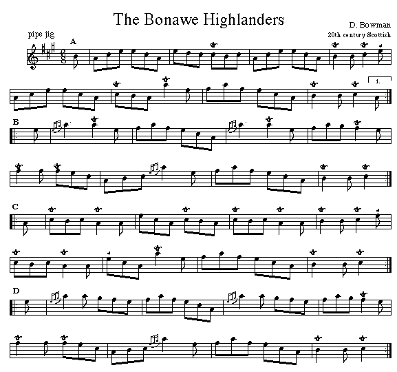 Played in Cape Breton as a jig, notation as a 6/8 march was first published with pipe gracings in The Scot's Guard. The sound clip comes from guitarist John Allan Cameron.