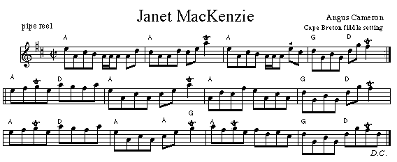 Played by Cape Breton fiddlers Dave MacIsaac, Joe MacLean, Dan Hughie MacEachern, Dan R. MacDonald, Alex Francis MacKay and Larry Parks In David Glen's Collection it was presented in both a strathspey and a reel setting. This Cape Breton setting from The Cape Breton Highland Collection borrows from both.