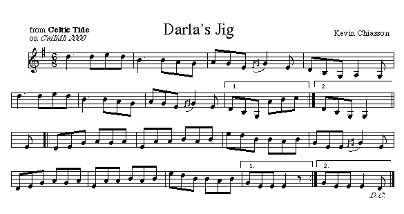 Since the days of the first 78s and subsequent radio broadcasts, The Chiasson families, from the Souris area of PEI have been strongly influenced by Cape Breton music.The current generation is lead by fiddler J.J. Chiasson who plays with the group Celtic Tide. It was composed for Darla Chiasson, the piano player of the group. A handsome jig, it can also be played in D by simply moving everything up one string. It can be be heard on Ceilidh 2000 a Celtic Colours compilation.