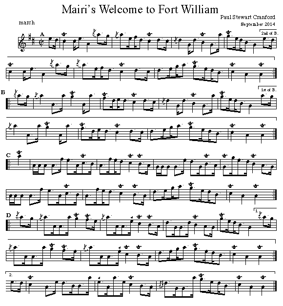 Pipe setting with graces here Written for Scottish fiddler, piper, veterinarian, Dr. Mairi Thom. Mairi first came to Nova Scotia perhaps 14 years ago on a trip to explore Cape Breton music. Eventually she moved here, and while living in the Baddeck area she worked as a vet and became a Canadian citizen. In 2013, she married a fellow Scot and recently they decided to move back to Scotland. Mairi is now a practicing veterinary surgeon in Fort William. last update 5/8/15 |
