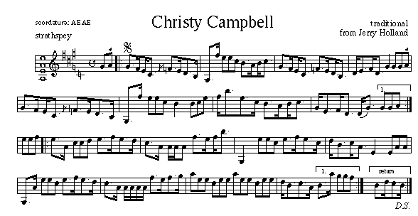 Christy Campbell is undoubtedly the most famous of tune in the Cape Breton 'raised bass' repertoire. A popular step dancing strathspey, some describe it as a modal Gaelic version of Nathanial Gow's classic tune The Miller of Drone. The arrangement above was transcribed from Jerry Holland's new solo CD Crystal Clear. It can be heard from that source by activating the real audio link below or by using the abcs
